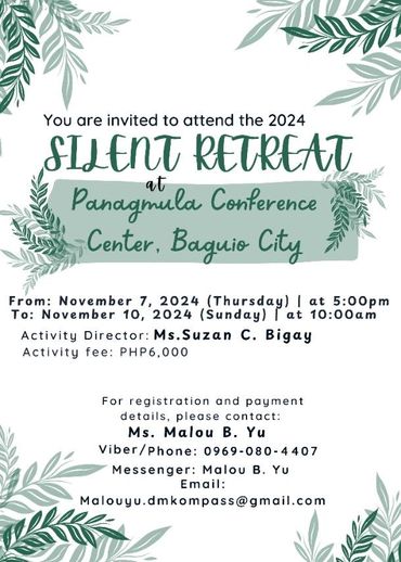 We invite you to join the upcoming Silent Retreat in Baguio City, a beautiful location to refresh your spirit and experience peace. Come, take this opportunity to retreat, reflect, and return home revitalized for the year ahead!